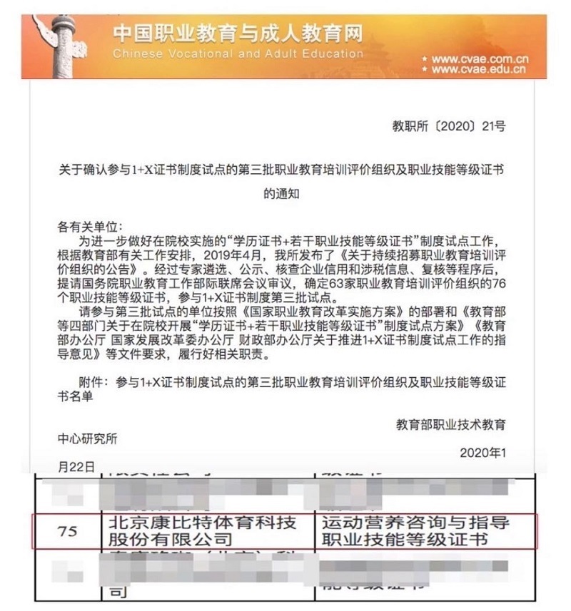 2019年4月16日,康比特成功入圍第三批職業(yè)教育培訓(xùn)評價組織名單, 成為教育部“1+X”計劃第三批職業(yè)教育培訓(xùn)評價組織,《運(yùn)動營養(yǎng)咨詢與指導(dǎo)職業(yè)技能等級證書》入選第三批職業(yè)技能等級證書。