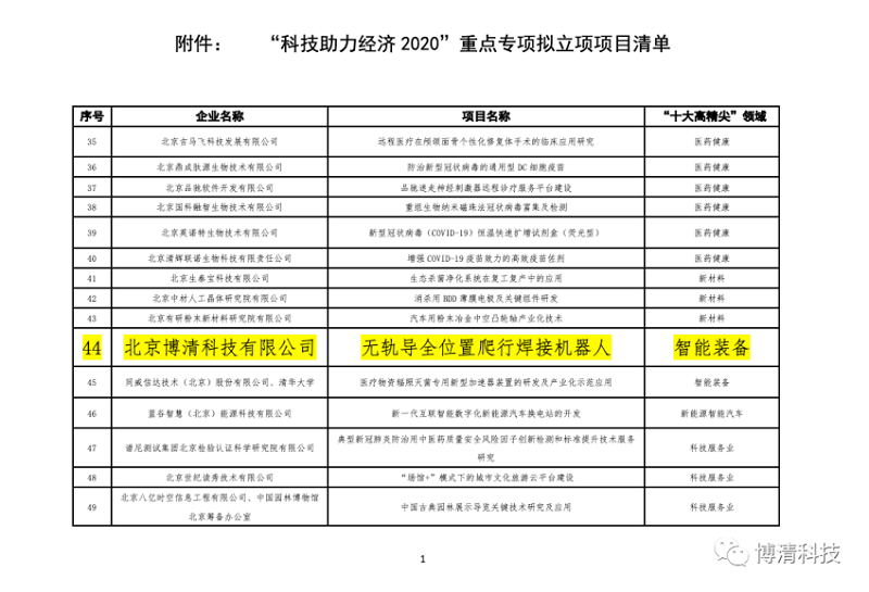 619日,根據(jù)《科技部關(guān)于組織推薦“科技助力經(jīng)濟(jì)2020”重點(diǎn)專項(xiàng)項(xiàng)目的通知(國(guó)科發(fā)資【202081號(hào))、《關(guān)于做好“科技助力經(jīng)濟(jì)2020”重點(diǎn)專項(xiàng)項(xiàng)目遴選及推薦工作的通知》(京科高發(fā)【202047號(hào))要求,北京市科學(xué)技術(shù)委員會(huì)發(fā)布了《關(guān)于“科技助力經(jīng)濟(jì)2020”重點(diǎn)專項(xiàng)擬立項(xiàng)項(xiàng)目的公示》,博清科技的 “無(wú)軌導(dǎo)全位置爬行焊接機(jī)器人”項(xiàng)目成功入選。