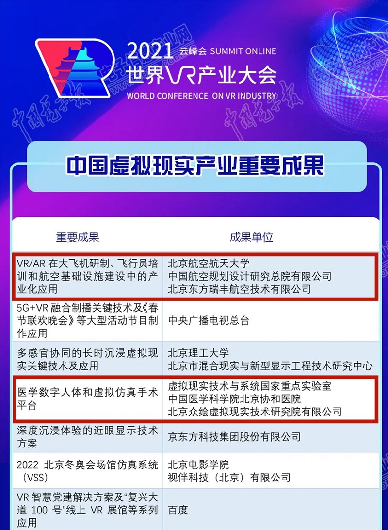 金科君創(chuàng)投資的北京東方瑞豐航空技術(shù)有限公司、北京眾繪虛擬現(xiàn)實(shí)技術(shù)研究院有限公司榮登“VR50強(qiáng)企業(yè)”榜單。兩家公司的“VR/AR在大飛機(jī)研制、飛行員培訓(xùn)和航空基礎(chǔ)設(shè)施建設(shè)中的產(chǎn)業(yè)化應(yīng)用”、“醫(yī)學(xué)數(shù)字人體和虛擬仿真手術(shù)平臺(tái)”也同時(shí)入選“15項(xiàng)重要成果”。這兩個(gè)項(xiàng)目均來源于虛擬現(xiàn)實(shí)技術(shù)與系統(tǒng)國家重點(diǎn)實(shí)驗(yàn)室科技成果轉(zhuǎn)化,分別在航空、醫(yī)學(xué)教育領(lǐng)域?qū)崿F(xiàn)落地應(yīng)用。