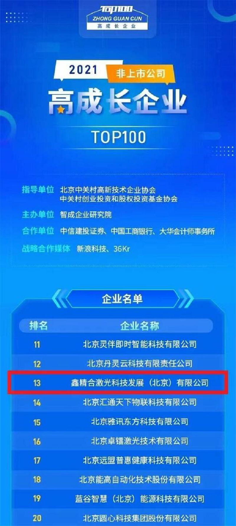 鑫精合入選“2021年度高成長企業(yè)TOP100”。