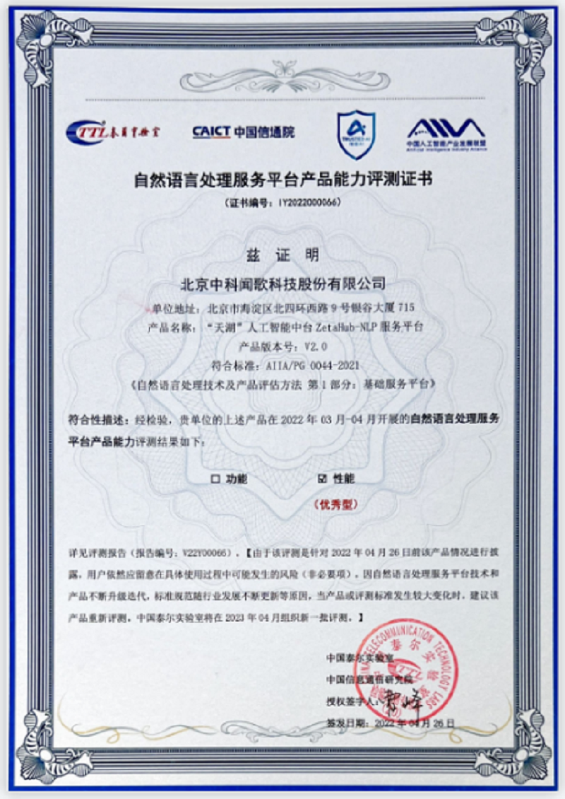近日,在中國信息通信研究院2022年組織的“可信AI”評(píng)測中,中科聞歌“天湖”人工智能中臺(tái)ZetaHub-NLP服務(wù)平臺(tái)獲得了性能優(yōu)秀型評(píng)價(jià)。平臺(tái)支持從數(shù)據(jù)標(biāo)注、模型訓(xùn)練到模型部署一站式服務(wù),提供中文分詞、句法分析、情感分析、文本分類、實(shí)體識(shí)別、詞向量、多語種翻譯、文本糾錯(cuò)等十余項(xiàng)基礎(chǔ)和高級(jí)NLP分析能力。