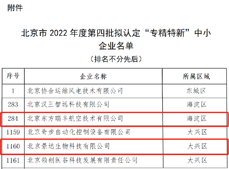 近日,北京市經濟和信息化局公布2022年度第四批擬認定“專精特新”中小企業(yè)名單。東方瑞豐、景達生物通過專家評審,榮獲“專精特新”中小企業(yè)稱號,充分體現(xiàn)了政府部門對企業(yè)自主創(chuàng)新能力和核心競爭力的認可。