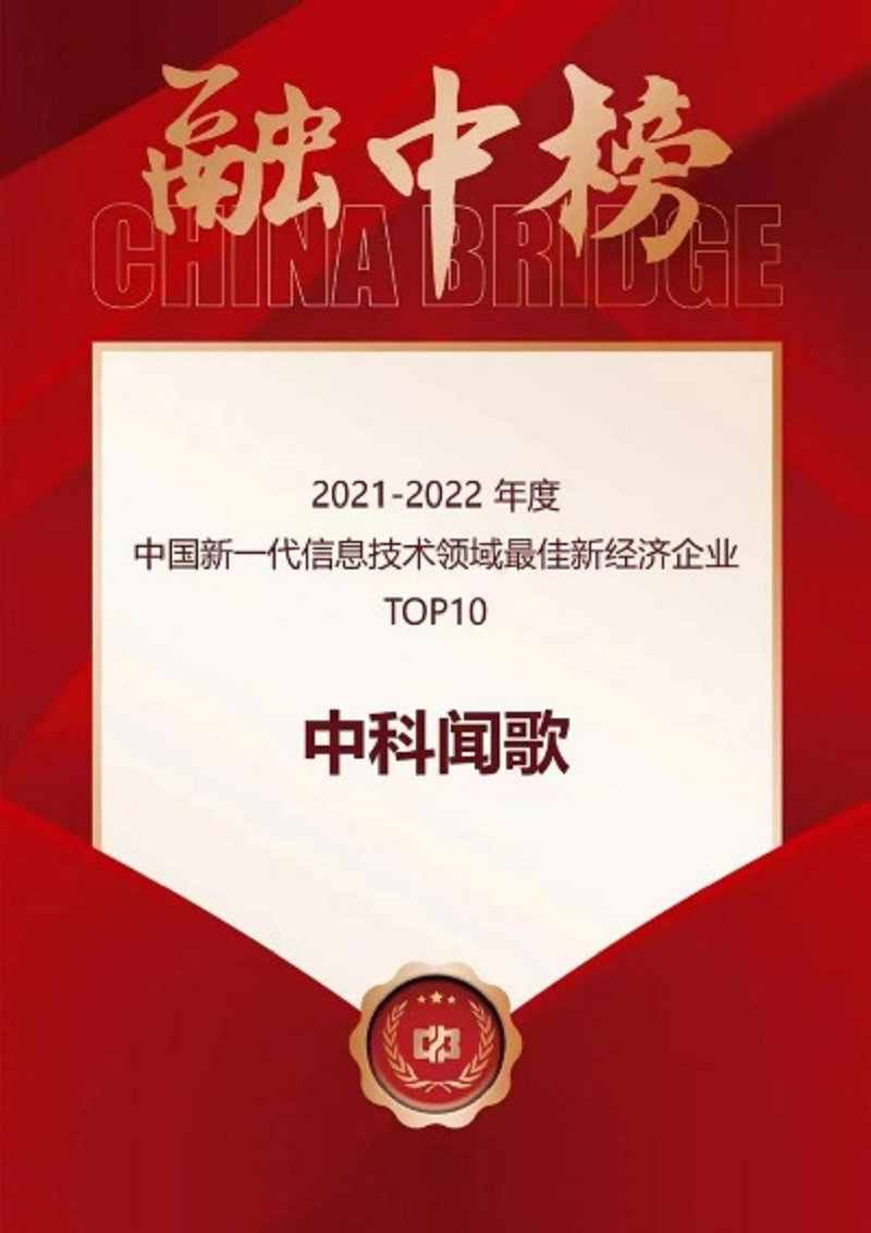 中科聞歌:榮獲“中國新一代信息技術領域最佳新經濟企業(yè)TOP10”