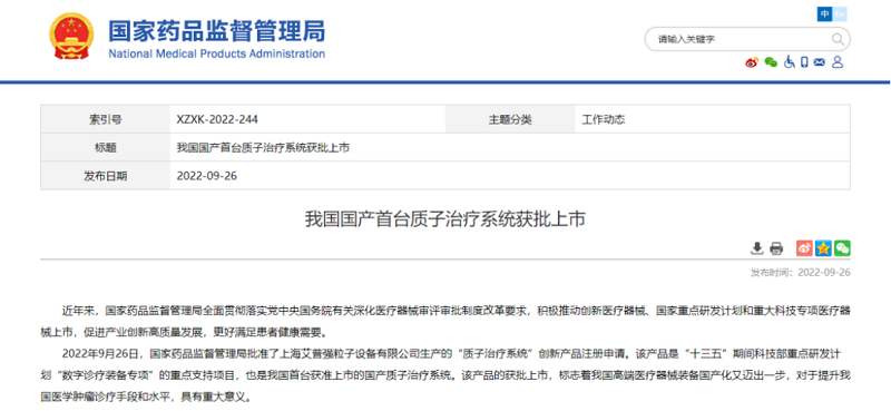 9月26日,國家藥品監(jiān)督管理局批準了上海艾普強粒子設備有限公司生產的“質子治療系統(tǒng)”創(chuàng)新產品注冊申請。該產品是我國首臺獲準上市的國產質子治療系統(tǒng),集成了瑞爾醫(yī)療圖像引導系統(tǒng),可以精確、高效地定位靶區(qū),實現(xiàn)腫瘤病灶的“精準清除”。這也標志著我國高端醫(yī)療器械裝備國產化又邁出一步,對于提升我國醫(yī)學腫瘤診療手段和水平,具有重大意義。