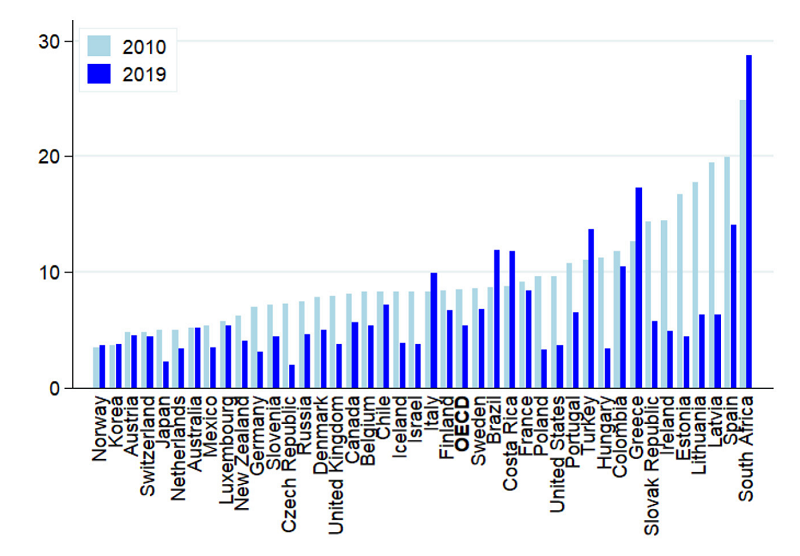 圖1.失業(yè)的演變:經合組織和選定的G20國家(2010年與2019年;占總勞動力的百分比)