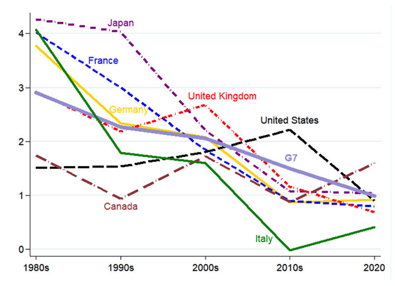 圖3.每小時勞動生產率增長(1980-2020年,G7國家,十年平均值)