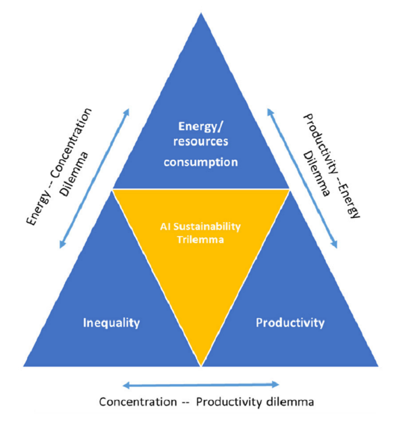 圖4總結了人工智能可持續(xù)性三元悖論的關鍵點:我們不能同時擁有低不平等、高生產力和生態(tài)可持續(xù)性,至少在追求人工智能驅動的自動化決策系統(tǒng)開發(fā)的當前技術范式時不能。只有兩個問題可以同時解決,而第三個需要被犧牲。