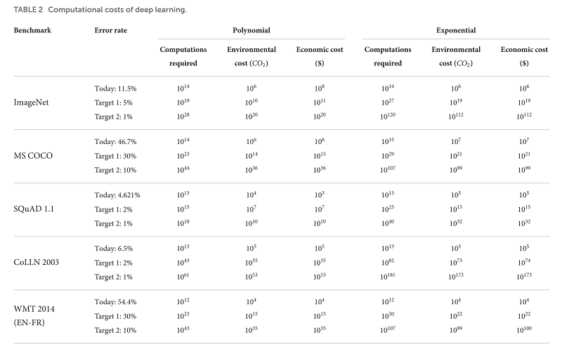 因此,一般數字設備的技術發(fā)展,特別是人工智能驅動的工具,表明在當前技術范式下,生態(tài)足跡呈指數級增長。對精度需求不斷提高推動的模型尺寸增長的簡單預測表明,經濟和生態(tài)成本將很快變得不可持續(xù)(見表2)。