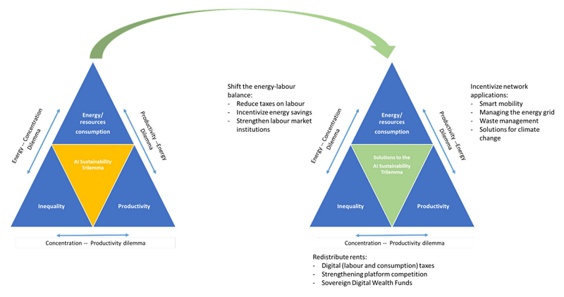 數字化和人工智能對工作世界的影響越來越大。大規(guī)模失業(yè)風險的上升引發(fā)了對技術的擔憂。有限的收入和生產力增長集中在少數科技公司身上,正在加劇不平等。此外,數字技術日益增長的生態(tài)足跡已經成為許多討論的焦點。這造成了技術進步帶來的不平等加劇、生產力增長緩慢和高生態(tài)成本的三元悖論。怎樣才能解決這個三元悖論?哪些數字應用應該特別推廣?政策制定者應該如何應對這個三元悖論?本文分析了現行工具在這方面的范圍和局限性,并討論了更符合數字經濟基礎新興技術范式性質的替代辦法,為應對人工智能的社會經濟挑戰(zhàn)所需的制度創(chuàng)新提出建議。