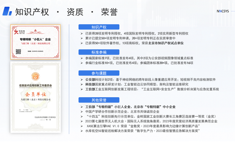 成立以來(lái),飛諾門(mén)陣聚焦科技前沿,基于原創(chuàng)性理論創(chuàng)新開(kāi)展技術(shù)研發(fā),在人工智能、視頻處理、算力調(diào)度、算網(wǎng)融合等前沿領(lǐng)域取得豐碩成果。公司參與編寫(xiě)了國(guó)家標(biāo)準(zhǔn)7項(xiàng),行業(yè)標(biāo)準(zhǔn)和團(tuán)體標(biāo)準(zhǔn)20余項(xiàng),已累計(jì)提交50余項(xiàng)發(fā)明專(zhuān)利申請(qǐng)并有28項(xiàng)已授權(quán),擁有4項(xiàng)國(guó)際發(fā)明專(zhuān)利,獲評(píng)國(guó)家級(jí)專(zhuān)精特新“小巨人”企業(yè)、北京市知識(shí)產(chǎn)權(quán)試點(diǎn)單位。
