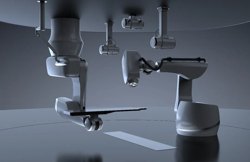 RayerKnife結(jié)合小型化直線加速器、準(zhǔn)直器自動(dòng)切換裝置、六自由度治療床、實(shí)時(shí)圖像引導(dǎo)、機(jī)器人運(yùn)動(dòng)控制、球面治療計(jì)劃等先進(jìn)技術(shù),在大范圍球面空間提供非共面多射野、非等中心照射模式,進(jìn)行立體定向放療。