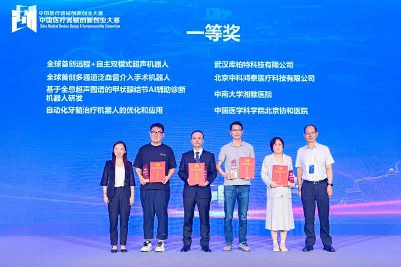 在第七屆中國(guó)醫(yī)療器械創(chuàng)新創(chuàng)業(yè)大賽上,中科鴻泰憑借全球首創(chuàng)多通道泛血管介入手術(shù)機(jī)器人,榮獲人工智能與醫(yī)用機(jī)器人類別賽一等獎(jiǎng)。
