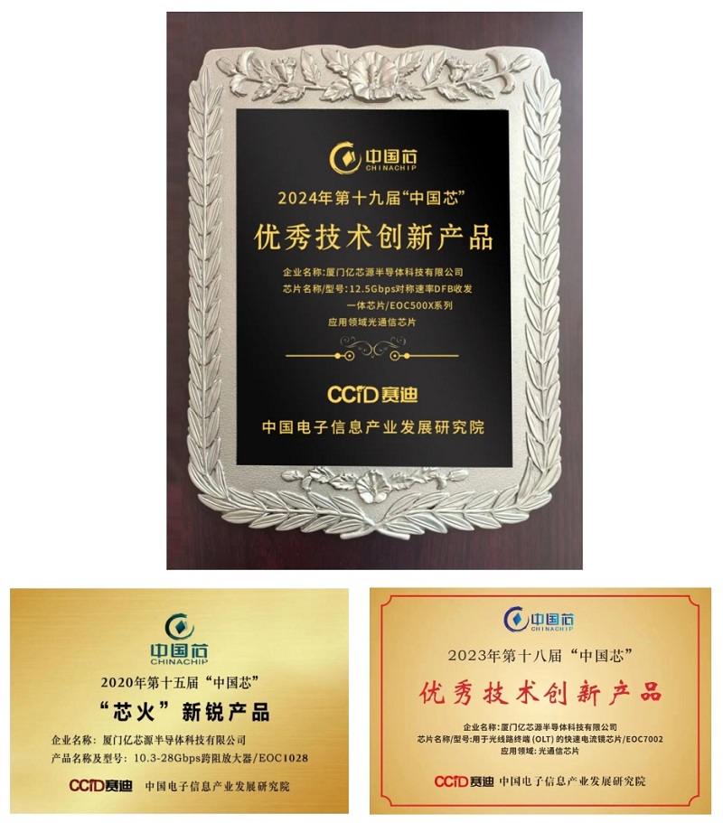 近日,2024中國微電子產業(yè)促進大會暨第十九屆“中國芯”優(yōu)秀產品征集結果發(fā)布儀式隆重舉行。本次活動由中國電子信息產業(yè)發(fā)展研究院主辦,是集成電路領域內最具影響力和權威性的活動之一,“中國芯”優(yōu)秀產品評選也被譽為集成電路產品和技術發(fā)展的“風向標”。君創(chuàng)Family企業(yè)廈門億芯源半導體科技有限公司(以下簡稱“億芯源”)自主研發(fā)的12.5Gbps對稱速率DFB收發(fā)一體芯片/EOC500X系列榮獲優(yōu)秀技術創(chuàng)新產品獎。這也是繼第十五屆和第十八屆之后,億芯源再次榮獲“中國芯”產品大獎,不僅彰顯了業(yè)界對公司技術創(chuàng)新能力的高度認可,更是對公司長期堅持科技創(chuàng)新、持續(xù)追求卓越精神的充分肯定。
