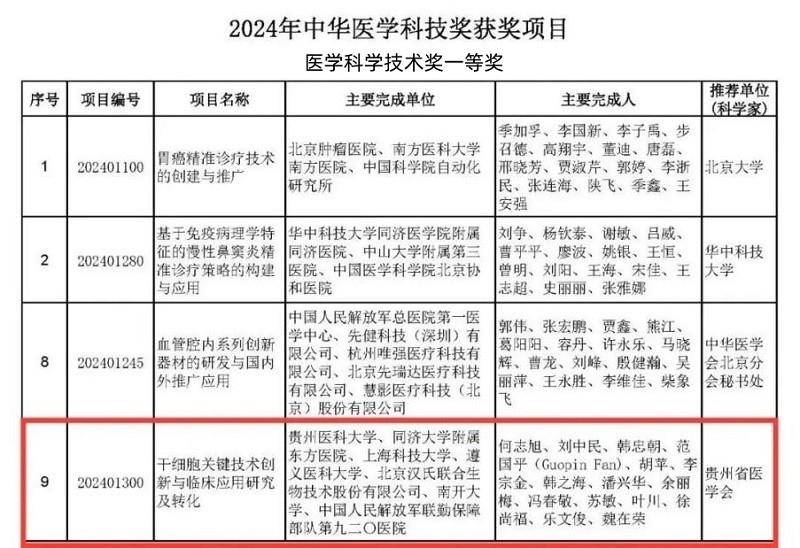 近日,中華醫(yī)學(xué)會(huì)科技評(píng)審部正式公布了2024年中華醫(yī)學(xué)科技獎(jiǎng)的獲獎(jiǎng)項(xiàng)目名單,共有80項(xiàng)(一等獎(jiǎng)9項(xiàng),二等獎(jiǎng)31項(xiàng)、三等獎(jiǎng)40項(xiàng))成果榮獲此殊榮。其中,由君創(chuàng)Family企業(yè)北京漢氏聯(lián)合生物技術(shù)股份有限公司(以下簡(jiǎn)稱(chēng)“漢氏聯(lián)合”)等7家機(jī)構(gòu)科研團(tuán)隊(duì)合作申報(bào)的項(xiàng)目《干細(xì)胞關(guān)鍵技術(shù)創(chuàng)新與臨床應(yīng)用研究及轉(zhuǎn)化》憑借其突出的創(chuàng)新性和實(shí)踐價(jià)值,榮獲中華醫(yī)學(xué)科技獎(jiǎng)一等獎(jiǎng)。
