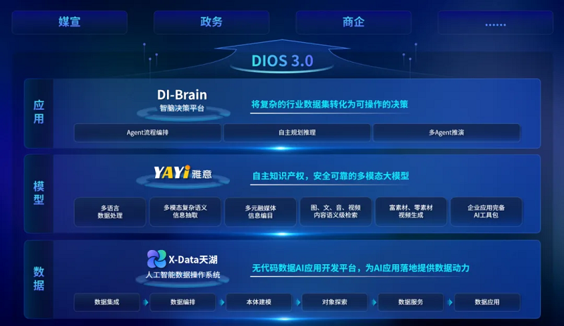 中科聞歌自主研發(fā)的決策智能操作系統(tǒng)DIOS(Decision Intelligence Operating System),面向政企級用戶,突破多語言理解、跨模態(tài)語義和復雜場景決策核心技術,具備從數據操作、模型構建到決策智能與場景應用全鏈條AI能力。DIOS在確保產品可靠性與安全性的同時,顯著降低AI落地成本和部署時間,全面服務于媒體、金融、政務、能源等行業(yè)的智能化轉型。