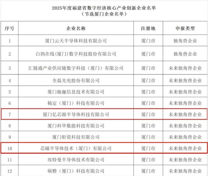 近日,福建省數(shù)據(jù)管理局正式揭曉 2025 年度福建省數(shù)字經(jīng)濟核心產(chǎn)業(yè)創(chuàng)新企業(yè)名單。君創(chuàng) Family 企業(yè)——廈門億芯源半導(dǎo)體科技有限公司(以下簡稱 “億芯源”)與芯瞳半導(dǎo)體技術(shù) (廈門) 有限公司(以下簡稱 “芯瞳半導(dǎo)體”),憑借在技術(shù)創(chuàng)新、自主研發(fā)及產(chǎn)業(yè)推動等方面的不懈深耕與突出表現(xiàn),成功入選 “未來獨角獸” 企業(yè)榜單。